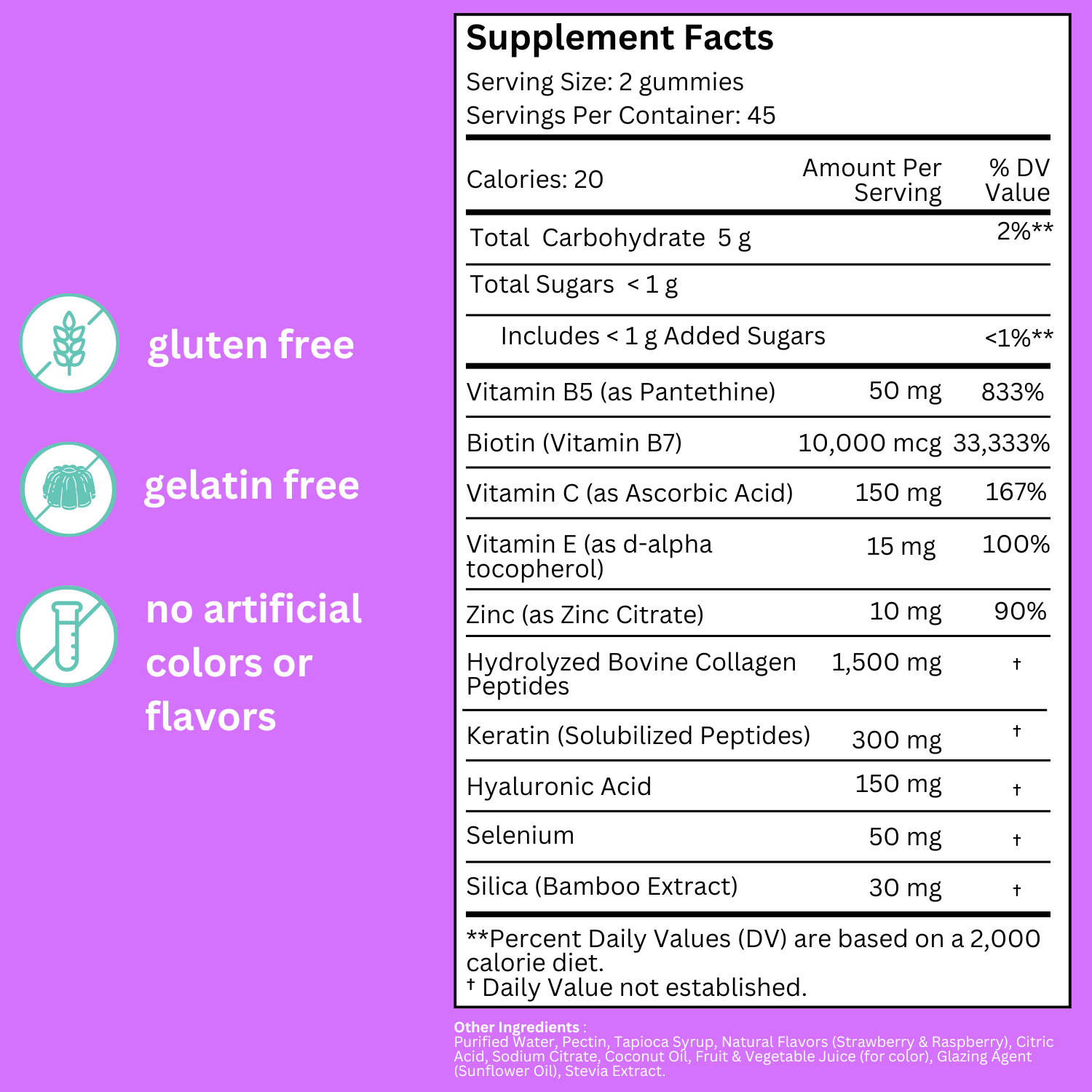𝐒𝐭𝐫𝐨𝐧𝐠𝐞𝐫 𝐅𝐨𝐫𝐦𝐮𝐥𝐚 𝐟𝐨𝐫 𝐌𝐚𝐱𝐢𝐦𝐮𝐦 𝐑𝐞𝐬𝐮𝐥𝐭𝐬: Riche en 10 000 mcg de biotine, 1 500 mg de collagène et 300 mg de kératine par portion, cette gomme avancée favorise des cheveux plus épais, des ongles plus forts et une peau éclatante.